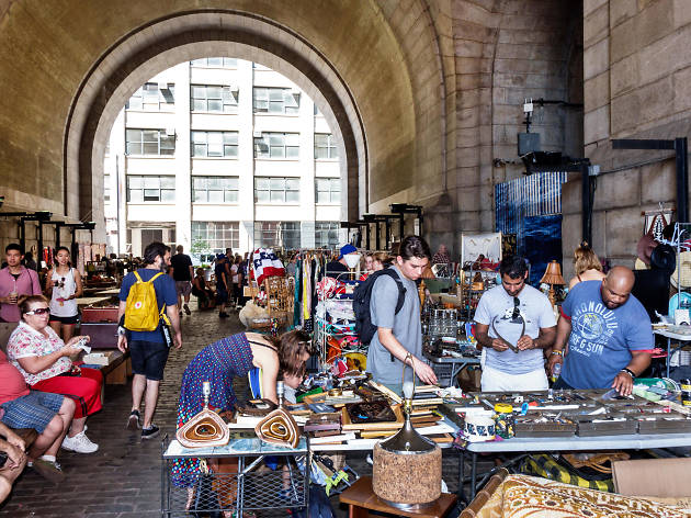 As far as vendors go, offerings at the Dumbo market include Smorgasburg-approved restaurants and food trucks, including Belgian fries by Home Frite and Shanghai-style savory crepes by Jianbing Company. You will also find unique clothiers such as Nina Z, who sells stylish Swedish clogs, and vintage purveyors like Past Lives Vintage. Booths hocking original art from as far away as Africa or as near as a neighborhood in Brooklyn sit side by side, overwhelming visitors with the variety of colors and textures. Other popular vendors include Thea Grant, with their selections of couture jewelry; Windsor Place Antiques, offering vintage prints and posters; and American Butt, where you can sift through retouched vintage clothing. Visitors to the market can leave weighed down with shopping bags secure in the knowledge that their purchases have helped support the very artists and curators who sold them their goods.