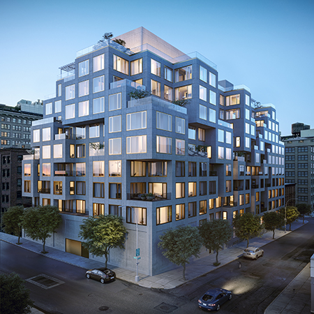 New photos at YIMBY show the pixelated exterior at 98 Front rapidly nearing completion just a month after the DUMBO condos hit the market. ODA’s design for the concrete and glass facade, which was inspired in equal parts by the surrounding warehouses and the cubist art movement, is reflected within these spacious homes, which feature large windows that look out on historic DUMBO and the Manhattan skyline beyond. Select homes at 98 Front feature private outdoor space nestled within the protruding squares, providing shade and privacy. Residents will enjoy access to a suite of luxury amenities, as well as convenient proximity to the A, C, and F trains.