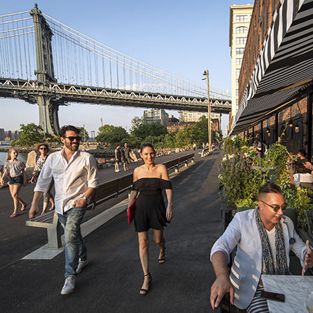 Occupying the space in Brooklyn between the landings of the Manhattan and Brooklyn Bridges, DUMBO is home to some of the borough’s finest dining. Eater recently released a list of their favorite spots to grab a bite in the dense little neighborhood, including the Michelin-starred River Cafe and the quaint Vinegar Hill House. These venues (and more) will quickly become favorites of residents at 98 Front, the collection of modern DUMBO condos for sale by ODA architects. This LEED-certified building is home to sleek residences ranging in size from studios to four bedrooms, all of which feature high ceilings and minimalist interiors complete with state-of-the-art appliances and Corian countertops in the kitchens.